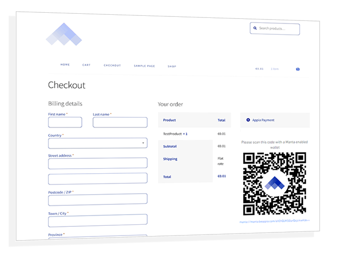Allow cryptocurrency purchases to be made from your webstore (e.g. WooCommerce) by integrating the open source Manta protocol.